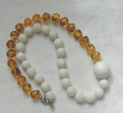 eine sehr schöne Edelsteinkette. Außergewöhnlich ist die Zusammenstellung der Edelsteine, ein brauner Bernstein mit einer weissen Koralle. Besonders reizvoll, die Edelsteine sind einseitig