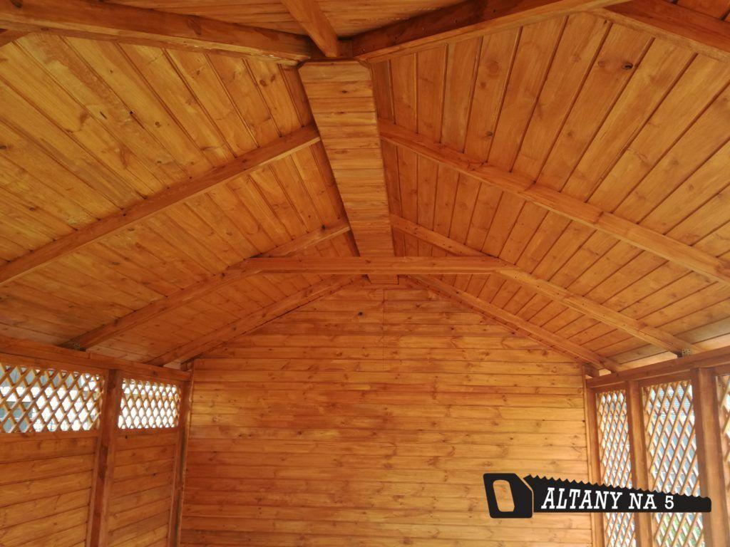 Wir laden Ihnen ein, eine schöne Holzgartenlaube aus Kiefer -und Fichtenholz zu kaufen. Die Laube wird aus Kiefernholz herausgestellt. Die ganze Konstruktion wird auf Tragsäulen gestützt. Das Holz wird mit Holzschutz Drewnochron in jeder ausgewählter Farbe imprägniert. Musterkatalogaufeines der Bilder. Die angebotene Konstruktion besitzt drei offene Wände, und eine Wand, die komplett bebaut ist. Das Gartenhaus hat 2 offene