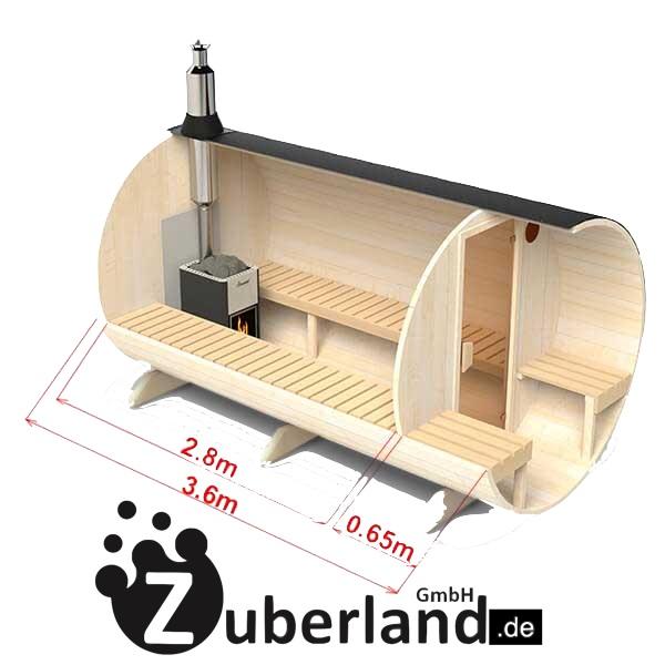 3, 6m Sauna aus Thermoholz, 2, 2m Durchmesser und Holzofen, Saunafass, Sauna-Fas