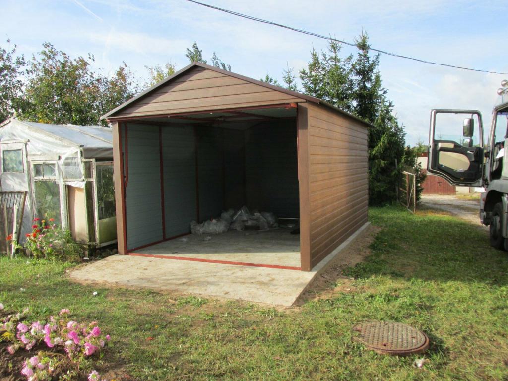 Wir bieten Ihnen hier: 3x5 holzverkleidete Blechgarage mit Satteldach und Schwingtor an.