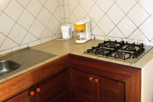Kleinküche mit Kochplatte, Kühlschrank, Kessel und Kaffeemaschine