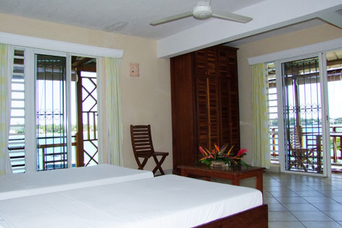 ein Schlafzimmer mit Doppelbett, 13 Quadratmeter mit Terrasse und direktem Blick auf die Bucht