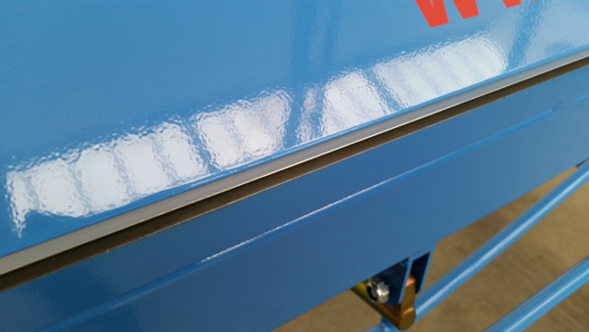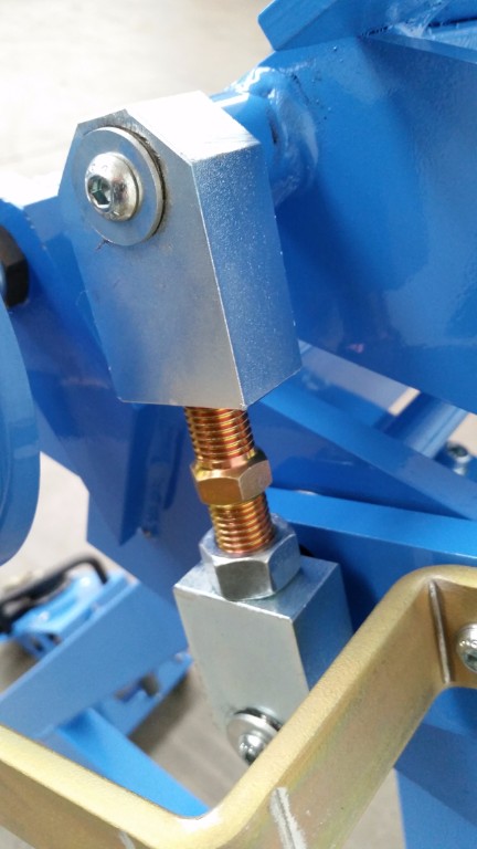 Kleinteile korrosionsfrei verzinkt. Die Bauweise ermöglicht Korrektur einzelner Elemente und sichert hohe Steifigkeit der Konstruktion. Die mechanischen Elemente, wie: Neigungswinkel des Druckbalkens, Druckkraft des Druckbalkens und Symmetrie des Oberbalkens gegenüber dem Unterbalken sind einstellbar. Die Rollenschere kann während des Blechzuschnitts in Endpunkten der
