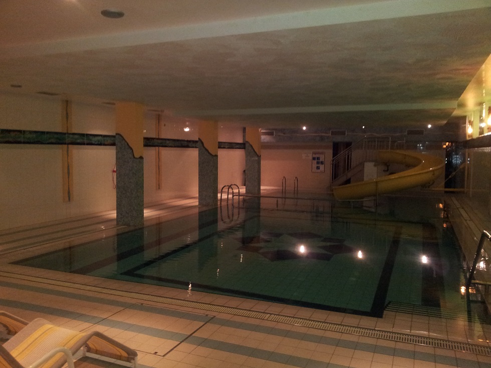Besonderes: Kostenlos Nutzbar ist auch die im Hotel liegende Badelandschaft (2012 vollständig saniert), mit Schwimmbad inkl. Wasserrutsche für Kinder, Dampfbad, Aroma-Sauna, Fuß-Kneippbecken, Planschbecken für Kleinkinder, Liegen und ein