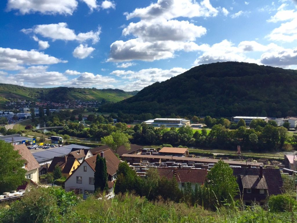 Industriegebiet an der Stadtgrenze zu Ingelfingen. Einen weiteren halben Kilometer nördlich davon liegt über dem Kochertal mit Aussicht über die Talebene der Sattelhof, nördliche Spitze des Stadtgebietes, das rechts des Tales nirgendwo wesentlich über die obere Hangkante hinausreicht.