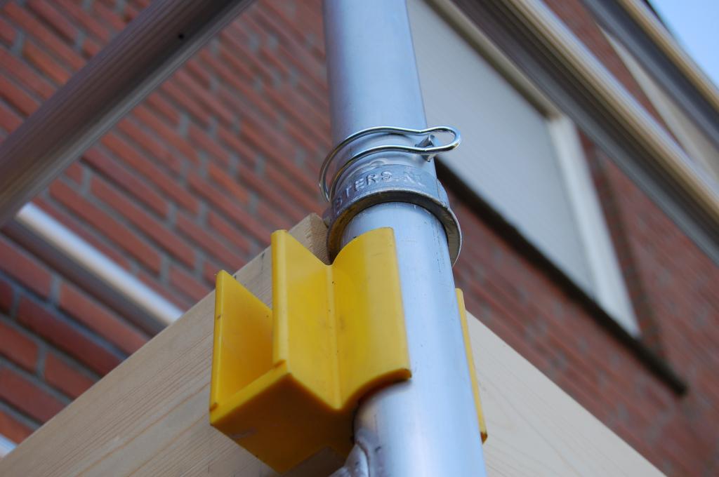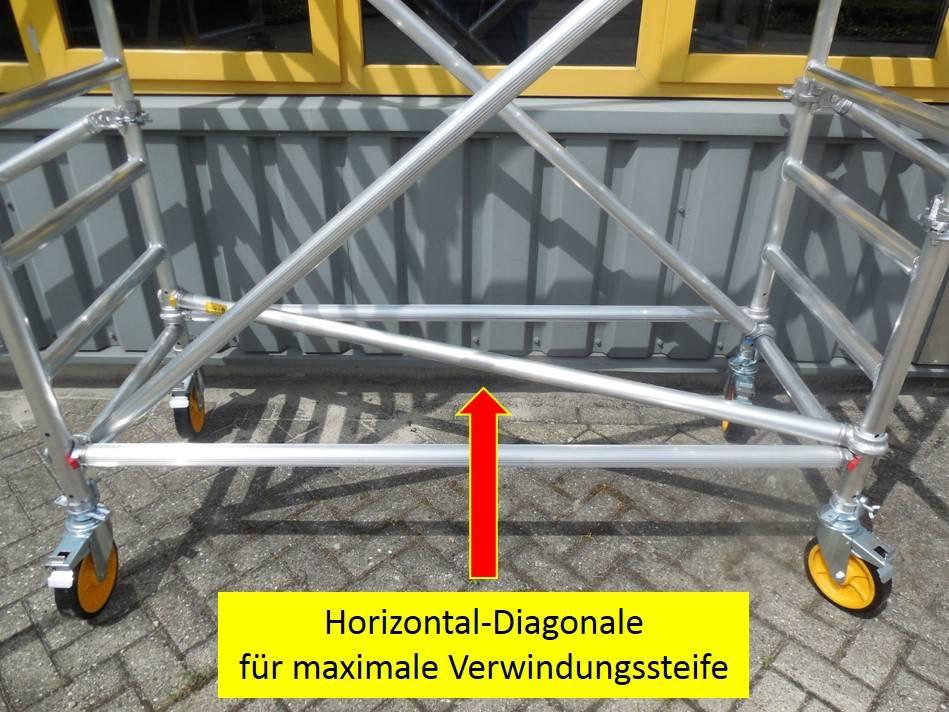 Besonderheit bei den CUSTERS-Rollgerüsten ist die "Horizontal-Diagonale", welche unten im Gerüst eingefügt wird. Sie bildet zusammen mit den normalen Horizontalstreben 2 statische Dreiecke, welche den CUSTERS-Gerüsten eine außerordentliche Stabilität und Verwindungssteife verleihen.