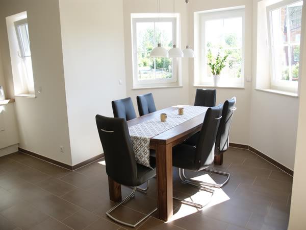 Wohnzimmer/Esszimmer: große Fensterfront, großer Essbereich mit 6 Stühlen, Ledersofa, Flat-Screen TV, Kamin,