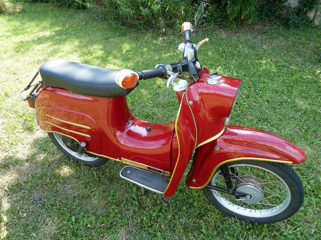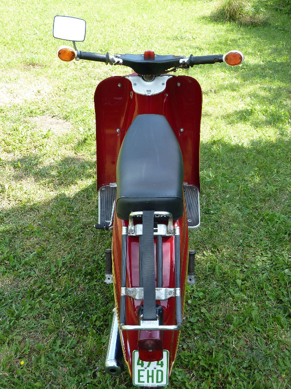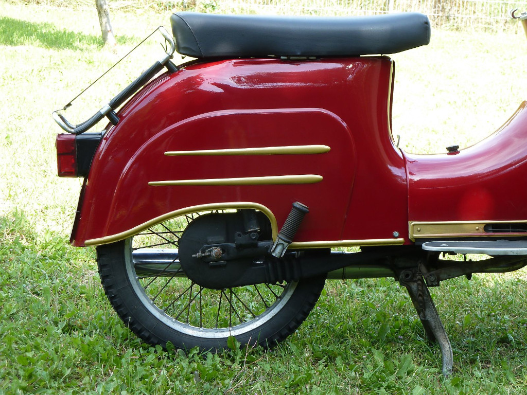 Karosserie wurde in weinrot mit gold neu lackiert, allerdings wurde das Moped danach noch benutzt und so gibt es dennoch bedingt durch die