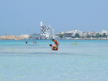 Das türkisblaue karibikähnliche Meer mit einem traumhaft flachen Sandstrand (Lido Sabbioso) ist nur ca. 350 Meter von der Unterkunft entfernt. Das kristallklare Wasser ist für Kinder besonders ideal.