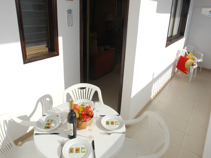 Im Wohnzimmer stehen zwei gemütliches Sofas, ein Esstisch sowie das Fernsehgerät deutsche und spanische Programme . Von hier aus geht man auf einen Balkon, auf dem ein Tisch mit Stühlen steht. Die Küche hat alle wichtigen Küchenutensilien, z. B. 4-Flammen-Gasherd, Kaffeemaschine, Toaster usw. Es gibt eine Waschmaschine. Das Badezimmer hat eine Wanne, Waschbecken, WC und Bidet. Handtücher,