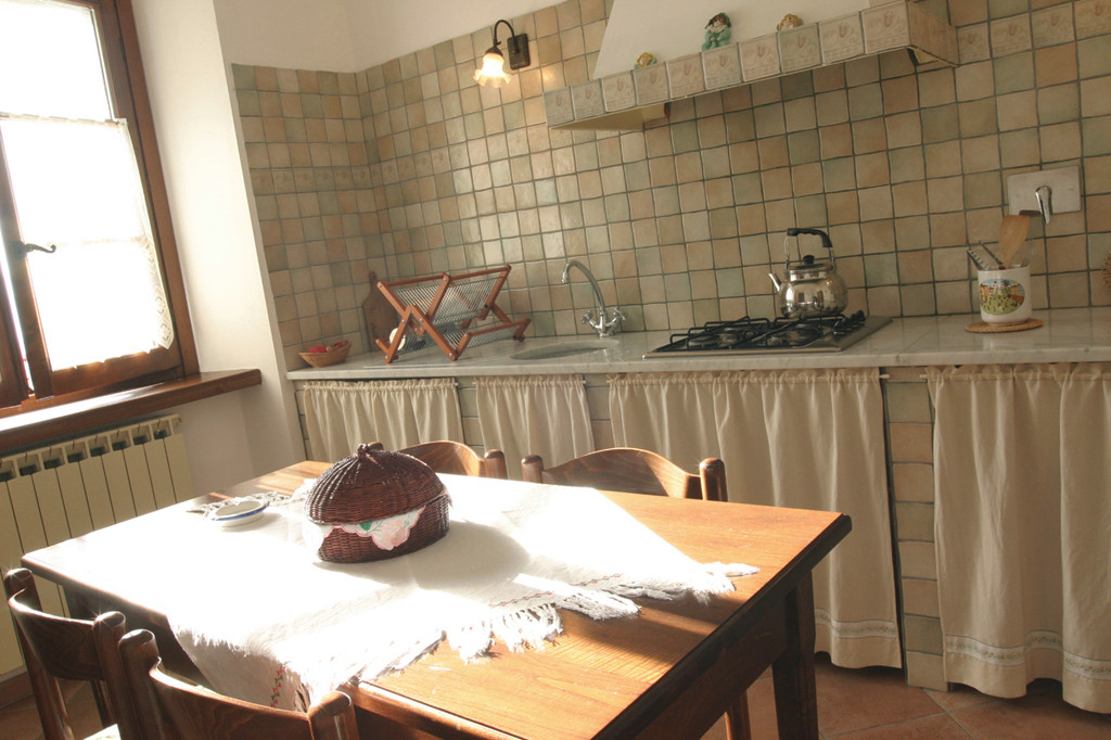 Küche mit antikem Marmor-Lavabo, Kühlschrank mit Tiefkühlschrank, 4 Gas-Kochplatten, Mikrowellen-Ofen, Komplett mit allen Küchenzubehöre und Kaffeemachine