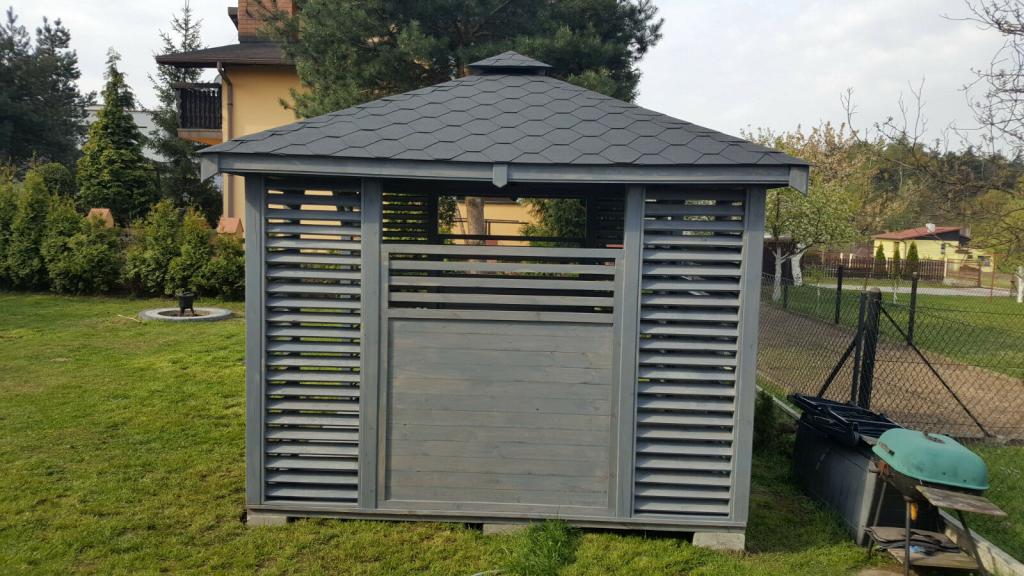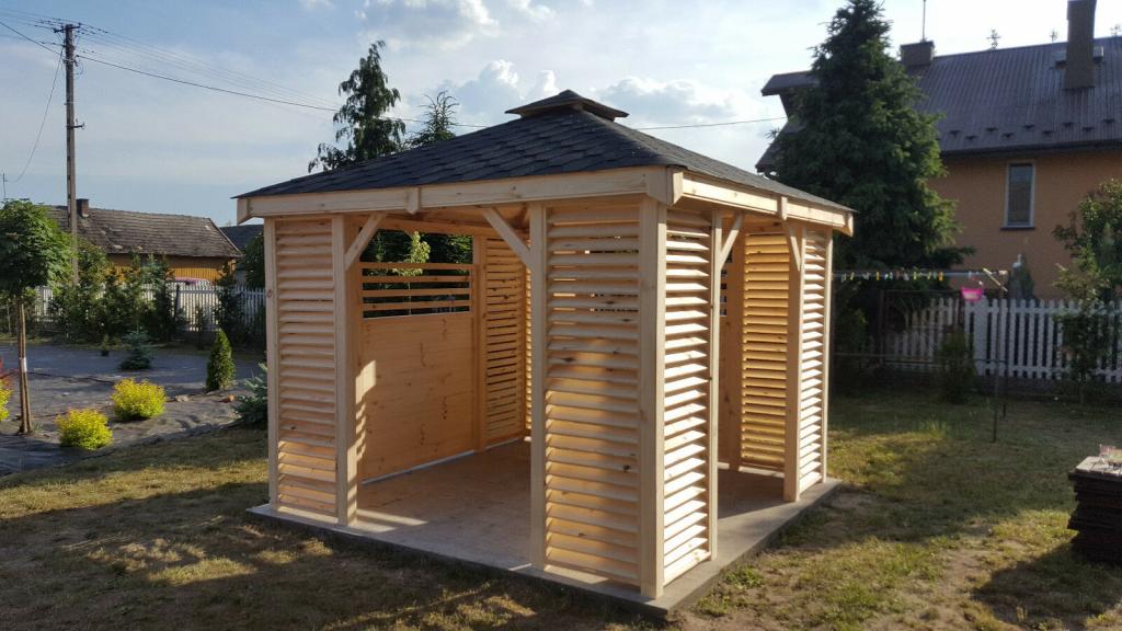 Dimensionen 3,5m x 3,5 m zu kaufen. Die Laube wird aus Kantholz aus Kieferholz herausgestellt. Die ganze Wandkonstruktion wird mit Holzschutz Drewnochron in von Ihnen ausgewählter Farbe imprägniert: Grün, Japanische Kirschfarbe, Wenge, Tik, Grau, Naturkiefer, Kiefer, Mittel Palisander, Palisander, Dunkle Nuss, Dunkle Eiche, Eiche und Zeder. Die angebotene Konstruktion besitzt eine offene Wand.
