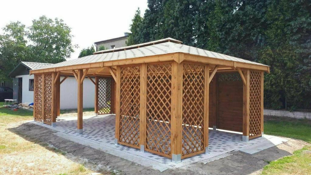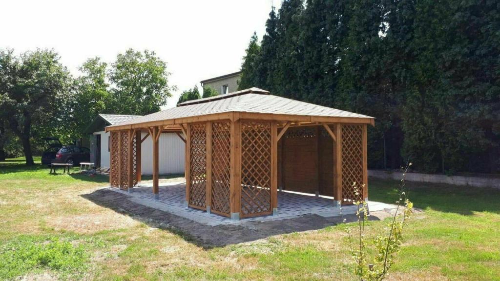 Dimensionen 4m x 8m zu kaufen. Die Laube wird aus Kantholz aus Kieferholz herausgestellt. Die ganze Wandkonstruktion wird mit Holzschutz Drewnochron in von Ihnen ausgewählter Farbe imprägniert: Grün, Japanische Kirschfarbe, Wenge, Tik, Grau, Naturkiefer, Kiefer, Mittel Palisander, Palisander, Dunkle Nuss, Dunkle Eiche, Eiche und Zeder.