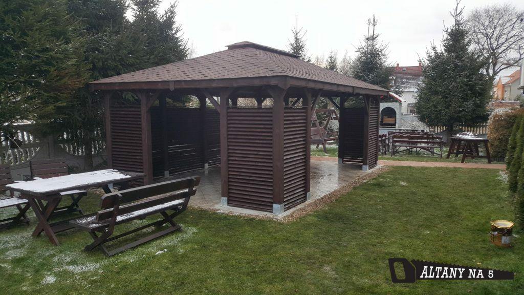Konstruktion wird auf Tragsäulen gestützt. Das Holz wird mit Holzschutz Drewnochron in jeder ausgewählter Farbe imprägniert, Musterkatalog auf eines der Bilder. Die angebotene Konstruktion besitzt drei offene Wände, und eine Wand, die komplett bebaut ist.