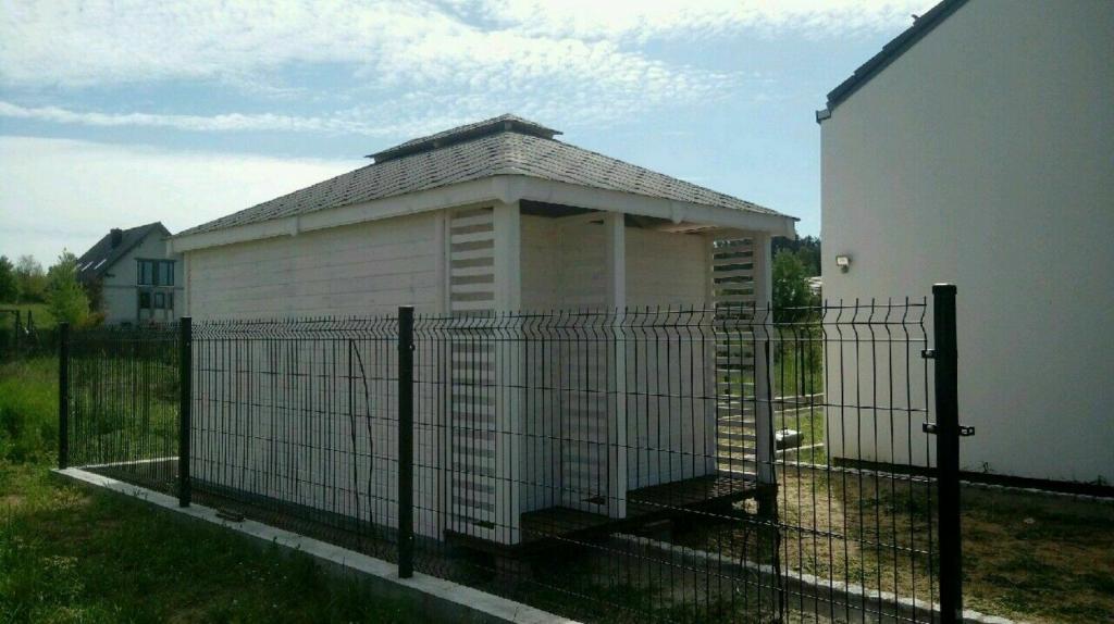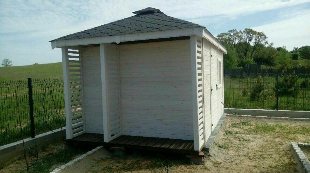 Abmessungen: 3x3, 5m, und der Holzschuppen: 0, 5x3m. Die Konstruktion wird aus Kiefernholz gefertigt, d. h. von Kantholz 8x4cm und Verkleidungsplatten (Nut-Feder-Verbindung). Der Holzschuppen und das Gartenhaus werden mit dem Holzschutz Drewnochron imprägniert, dank der Imprägnierung werden sie mehr gegen schädliche Witterungseinflüsse widerstandsfähig sind. Die Farben der Imprägnierung zur Auswahl:Grün, Japanische Kirschfarbe, Wenge, Tik, Grau, Naturkiefer, Kiefer, Mittel Palisander, Palisander, Dunkle Nuss, Dunkle Eiche, Eiche und Zeder. Die Muster finden Sie auf die Palette unten.Das Gartenhaus wird mit der Tür ausgestattet, in von Ihnen gewählte Größe, und it einem Fenster 60x40cm (Es ist möglich, die Größe zu ändern). Die Tür kann mit einem Griff oder mit einem Riegel geschlossen werden.Das Gartenhaus und der Holzschuppen werden mit wird mit Bitumenschindeln gedeckt (Farben und Mustern zur Auswahl auf dem Musterstück: schwarz, braun, rot, grün).