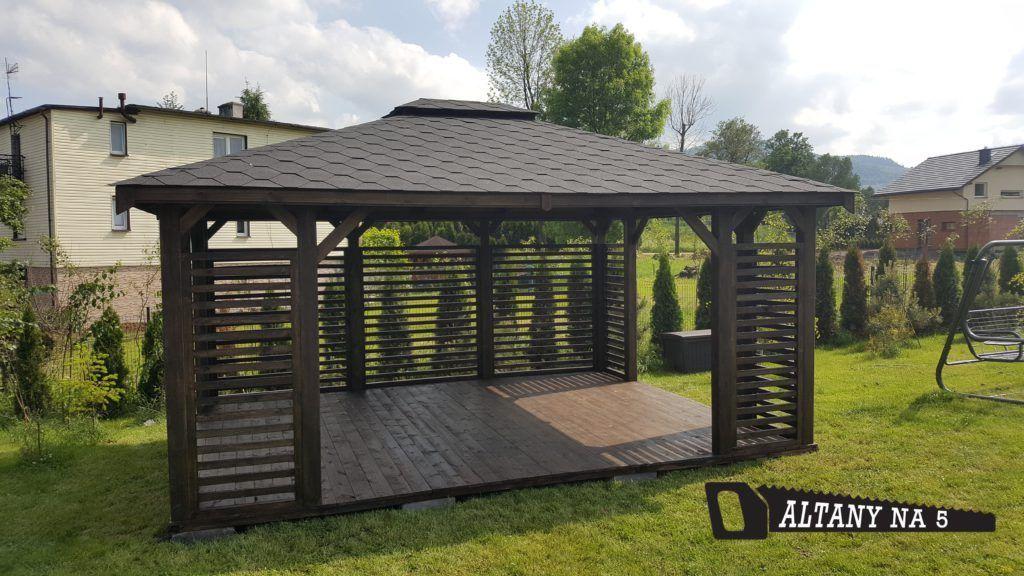 Wir laden Ihnen ein, eine schöne Holzgartenlaube aus Kiefer -und Fichtenholz zu kaufen. Die Laube wird aus Kiefernholz herausgestellt. Die ganze Konstruktion wird auf Tragsäulen gestützt. Das Holz wird mit Holzschutz Drewnochron in jeder ausgewählter Farbe imprägniert, Musterkatalog auf eines der Bilder. Die angebotene Konstruktion besitzt drei offene Wände, und eine Wand, die komplett bebaut ist.