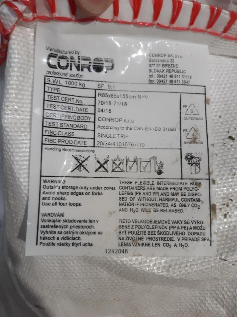Die gebrauchten, restentleerten Big Bags mit den Maßen 85 x 85 x 155 cm, 1250 kg Tragkraft, vorheriger Inhalt ''Tonmineralien'', fallen in der Nähe von Linz an.