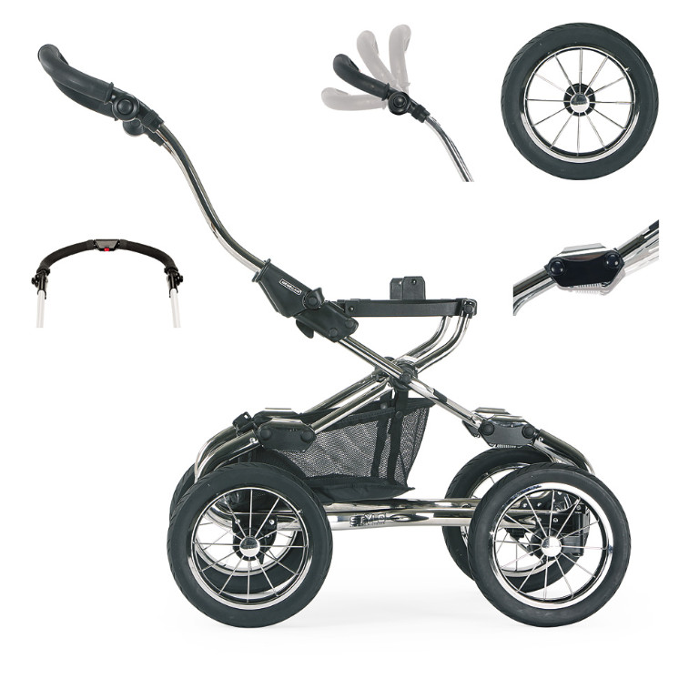 Das Kinderwagenmodell Stylo APS zeichnet sich durch kleinere und breitere Speichenräder aus, welche sich besonders für das