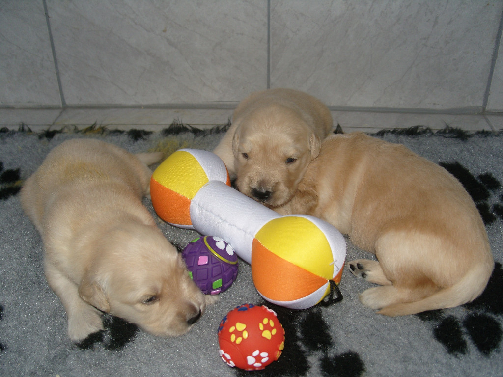 Retriever Welpen geboren. Es sind 1 Hündin und 3 Rüden. Sie werden bei uns liebevoll und sachkundig aufgezogen, sodass die Welpen wesensstark und gut geprägt sind. Beide Eltern Leben bei uns, die Mutter ist HD-, der Vater HD-, ED-, OCD- und PRA- frei. Bei Abgabe sind die Welpen zweimal geimpft (mit 6 und mit 8 Wochen), zweimal tierärztlich untersucht, gechippt und haben einen EU -