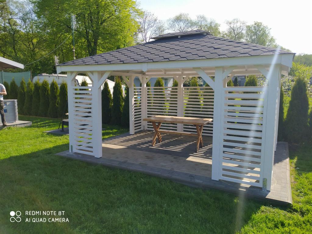 Wir laden Ihnen ein, eine schöne Holzgartenlaube aus Kiefer -und Fichtenholz zu kaufen. Die Laube wird aus Kiefernholz herausgestellt. Die ganze Konstruktion wird auf Tragsäulen gestützt. Das Holz wird mit Holzschutz Drewnochron in jeder ausgewählter Farbe imprägniert. Musterkatalogaufeines der Bilder. Die angebotene Konstruktion besitzt drei offene Wände, und eine Wand, die komplett bebaut ist. Das Gartenhaus hat 3 offene Eingänge.