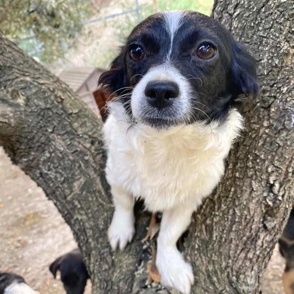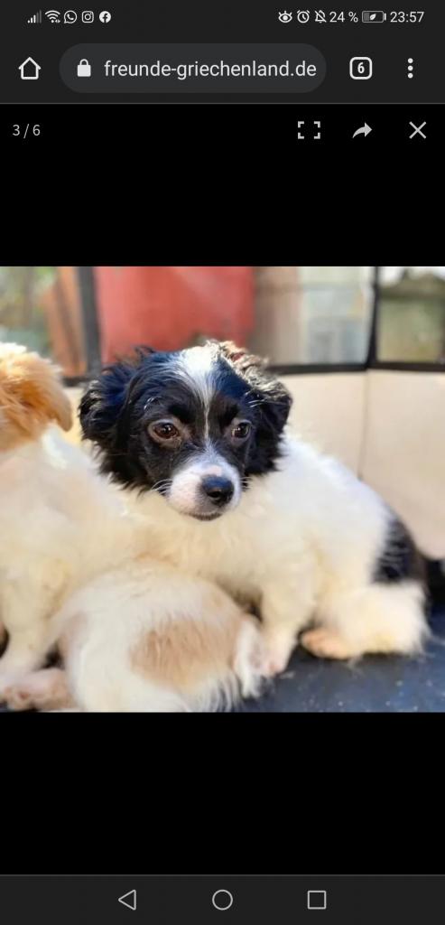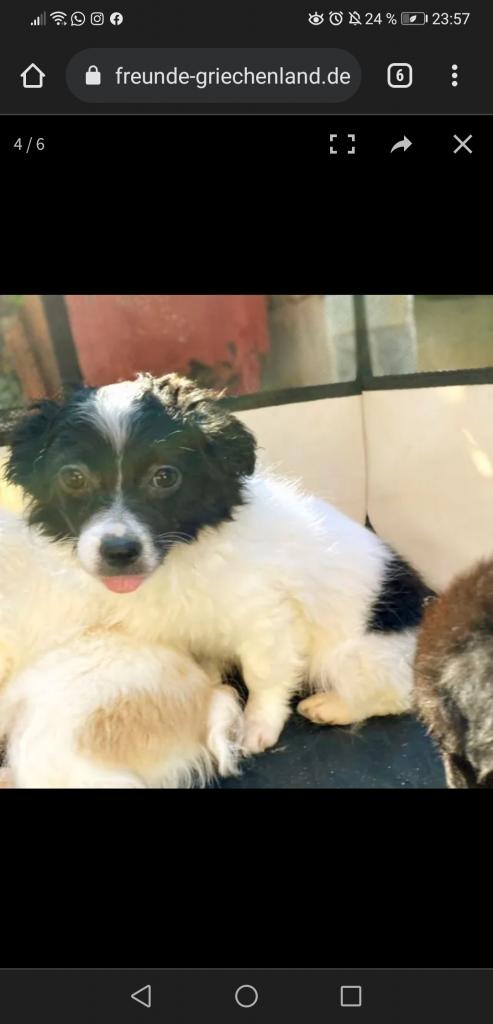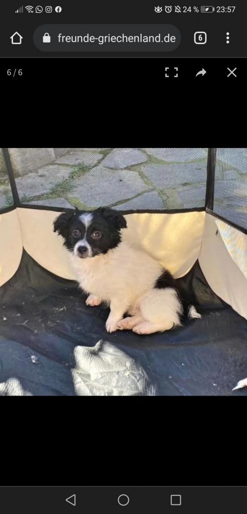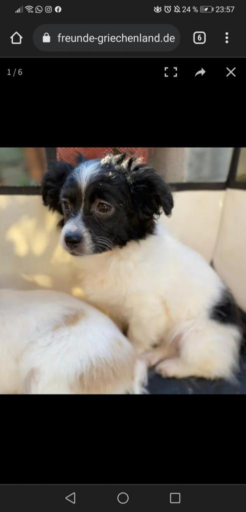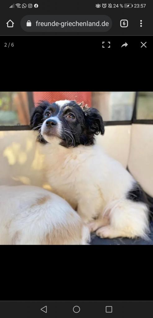 Hera und ihre Schwester Daphne suchen noch ein Zuhause. Die Mutterhündin lebt bei einer älteren griechischen Name, die aber die Welpen nicht behalten wollte und so sind diese bei Aliki angekommen. Hera ist eine hübsche, aufgeschlossene Hündin, die schon allein durch ihre interessante Fellzeichnung schwarz-weiß auffällt. Aber nicht das allein ist besonders reizvoll, ihr liebes soziales Wesen ist besonders hervorzuheben. Sie mag Menschen groß und klein, verträgt sich mit allen Hunden, mit denen sie bei Aliki lebt. Aber eigentlich würde sie gern sich auf eine Freundin oder einen Freund konzentrieren, mit der/dem sie ausgiebig kuscheln kann. Sie ist nicht sehr groß, dafür quirlig neugierig und bringt ihre Umgebung sicher schnell zum Schmunzeln. Wer mag sich von Hera um den Finger wickeln lassen?Aufgrund der Gesetzeslage kann sie leider nur in Deutschland adoptiert werden, sie hat eine verkürzte Rute.