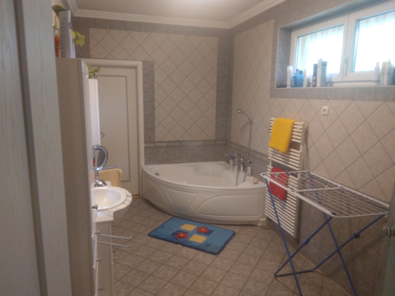 3 Zimmer, großes Wohnzimmer mit Kamin, Esszimmer und zugehörige Küche im amerikanischen Stil, 2 Garderobe-Zimmer, 1 großes Badezimmer, 1 separates WC , Durchgang mit der Garage verbunden ,überdachte Terrasse vom Wohnzimmer,