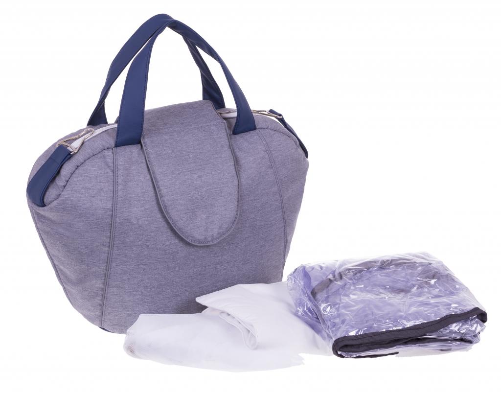 Kinderwagen ALFA 3in1 ,,OCEAN" ist hellgrauer Farbe mit blauem Öko-Leader. Herausgestellt ist er aus speziellem Stoff, in dem die Wassertrofen nicht versickern, nur nach ihm abfließen, und Öko-Leader-Elementen.