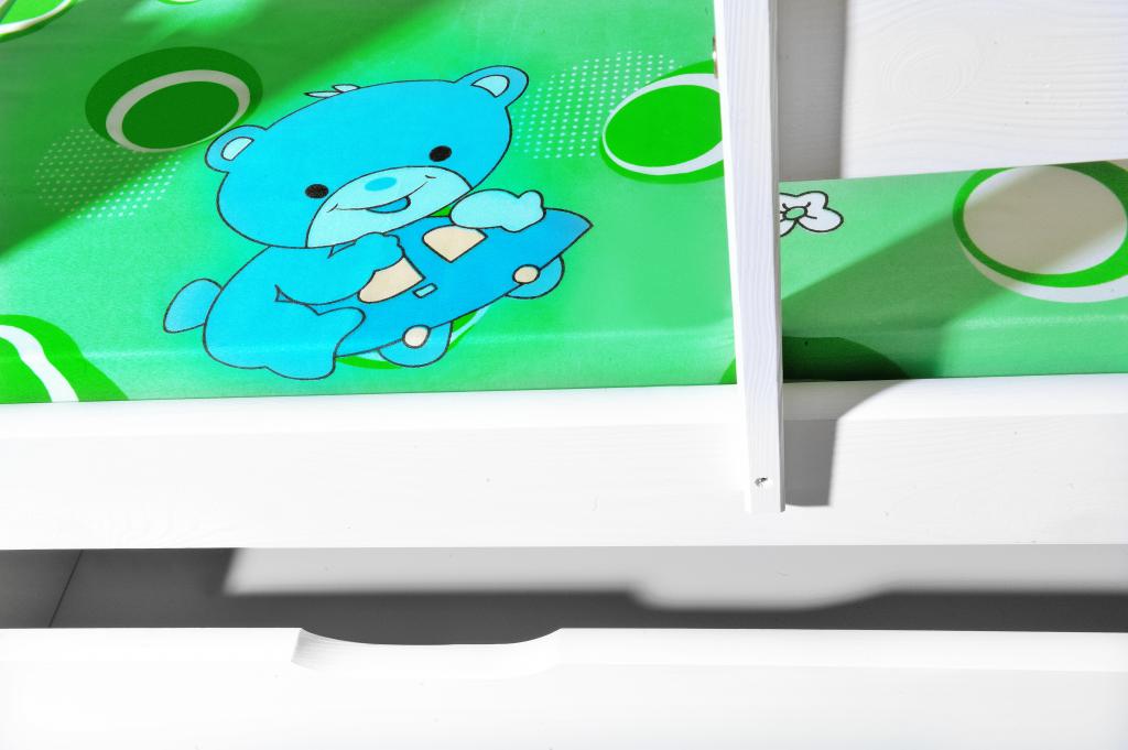 Das Kinderbett mit Sternen aus einer MDF Platte an Kopf - und Fußteile gemacht werden, 100% Kiefer Rausfallschutz: Dopellakiert mit Wasseremaille, sicher für Kind und Umgebung. Im Set enhalten: Bett, Schublade in Bettlänge, zwei Sicherheitsbarrieren (1x in kompletter Bettlänge, 1x 3/4 Länge des Bettes), Schaumstoffmatratze (8 cm dick) mit Reißverschlussabdeckung und Holzlattenrost.