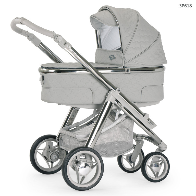 Der außergewöhnliche Kinderwagen ist in den Farben SP617 (beige), SP618 (grau) und SP620 (schwarz) erhältlich. Das Gestell ist jeweils an die Farbe des Wannenaufsatzes angepasst.