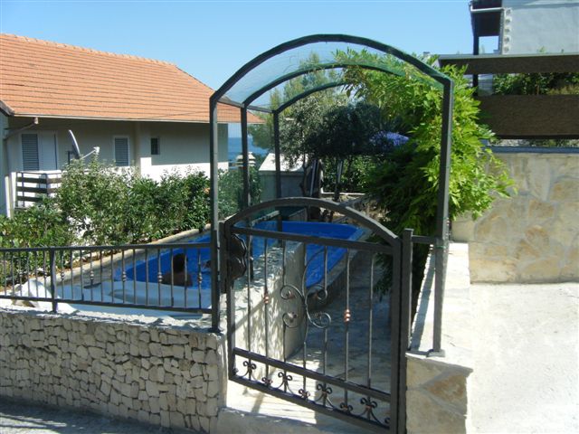 Badezimmer. Wohnzimmer sowie Küche haben Ausgang auf eine große Terasse mit Meerblick , und auch von dieser Terrasse aus kann man auf den anderen Teil des Gartens, wo Sie im Freien Kamin und Pool mit automatischen Reinigungssystem ausgestattet finden gehen. In diesem Teil des Gartens ist auch ein Keller als Lagerraum genutzt. Garten ist mit traditionellen dalmatinischen