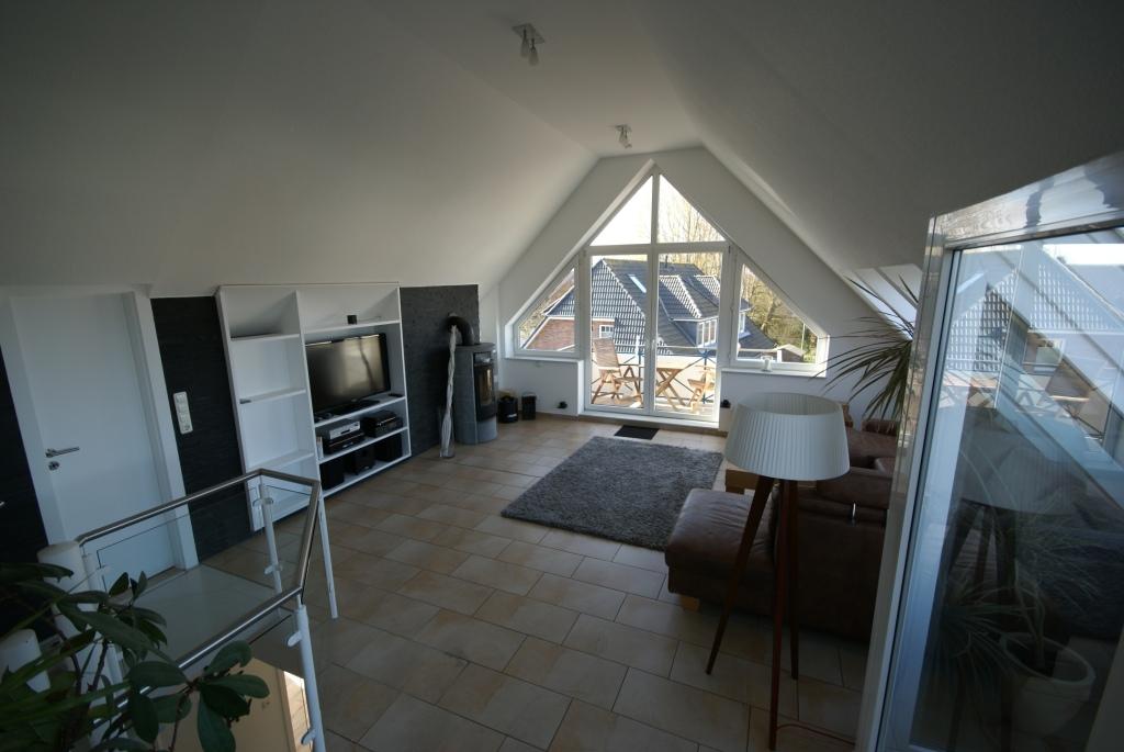 Wohnzimmer im Dachgeschoss: sehr hell und großzügig gestaltet, großes Luxus-Sofa, Flachbildfernseher 46 Zoll, Dolby-Heimkinoanlage, Stereoanlage, CD-/DVD-Player, Kamin