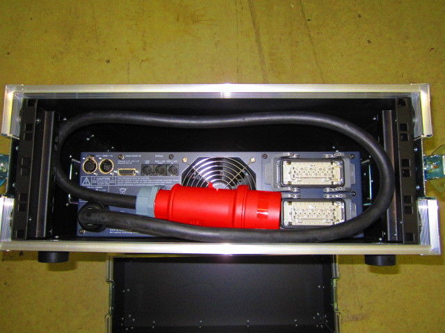Absicherung der Kanäle je über einen C 10 A Automat und Gesamt - FI / RCD 40/0,03 A Einspeisung über 5 Pol. CEE Stecker 32 A. (CEE 32 A Stecker ist mit dabei, aber noch nicht angeschlossen, da unbenutzt!) Lastausgang über 2 x 16 Polige Harting