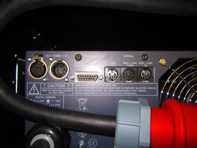 Anschlüsse. DMX Signal in/out über 5 Pol XLR Buchsen. MIDI in/out/tru über 5 Pol DIN Buchsen. Die wesentliche