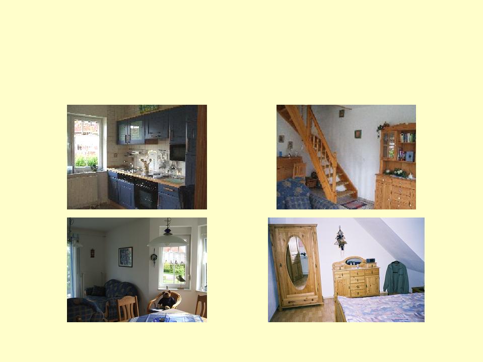Doppelschlafcouch für 2 Personen), Bad mit DU/WC, Gäste-WC, Küche mit Küchenzeile (Geschirrspülmaschine, Kühl-/Gefrierkomi, Mikrowelle), Wohnzimmer mit Essecke im Erker, Ausgang zu Terrasse mit Grillkamin und Garten mit Strandkorb, Kinder-/Kletterschaukel, Sandkasten, Gartenhaus mit 4 Fahrräder.