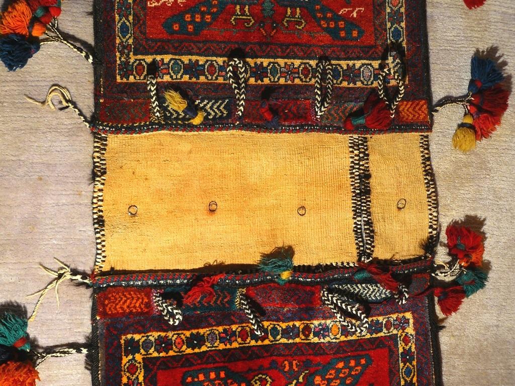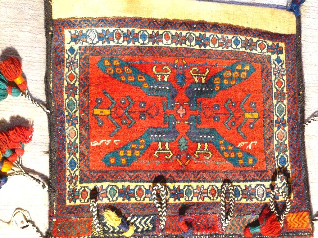 Bemerkungen: Äußerst stabile Konstruktion, wurde nicht als Deko. gefertigt, war ihrem Zweck entsprechend eingesetzt. Motiv der Taschenfronten, jeweils 4 Pfauen, signiert, als Verzierungen viele Zottel und Bommeln, zweifarbige Befestigungsschlaufen, alles sehr stabil original und unbeschädigt. Ein Typisches Produkt der nomadisierenden ländlichen