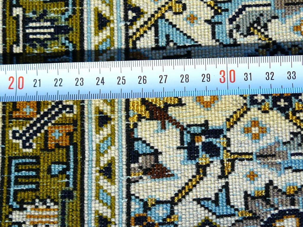 Bemerkungen: Die meisten billigen Ghom, die angeboten werden sind Kopien aus Indien und Pakistan, sie werden aus billiger Importwolle in großen Mengen hergestellt. Originale gehören zum Besten was die orientalische Knüpfkunst zu bieten hat. Dieser hier ist nie begangen worden, er ist so gut und dicht verarbeitet, dass der optische Eindruck ihn wie eine Fläche aus Samt wirken lässt. Sehr strapazierfähig. Die Konturen der Muster sind aus Seide, dadurch wird der exklusive Gesamteindruck noch verstärkt. Spitzenwolle kostet wesentlich mehr als Seide.. Die "Originalität, Alter, Qualität, Zustand und der künstlerische Aspekt sind die wesentlichsten Faktoren bei der Bewertung eines Teppichs". (Heute gilt die Faustregel für neue Ware der klassischen Iranischen Provenienzen, 1 Million Knoten kosten 10.000 € im Ursprungsland).