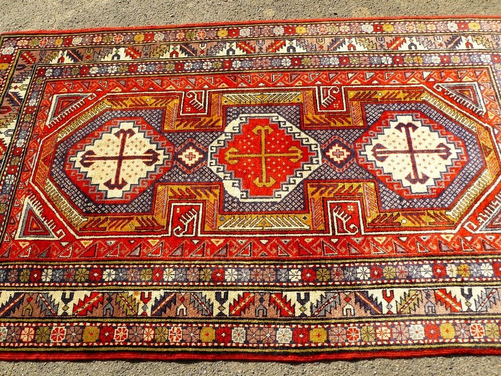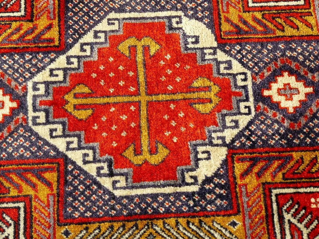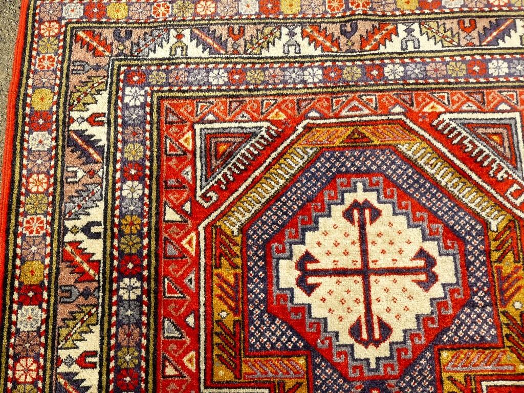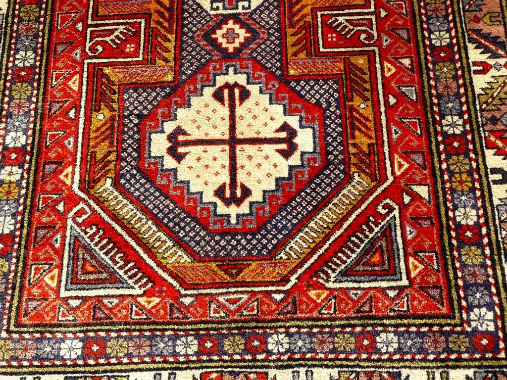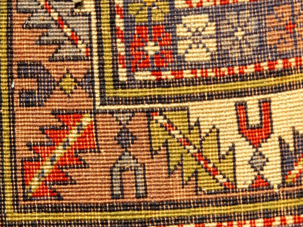 Bemerkungen: Harte Wolle, feste Knüpfung, kurze Schur. Schöne alte Farben. Viele fast identische Stücke sind in der Literatur zu finden alle werden mit zwischen 5.000,- und 15.000,- bewertet, auf Basis