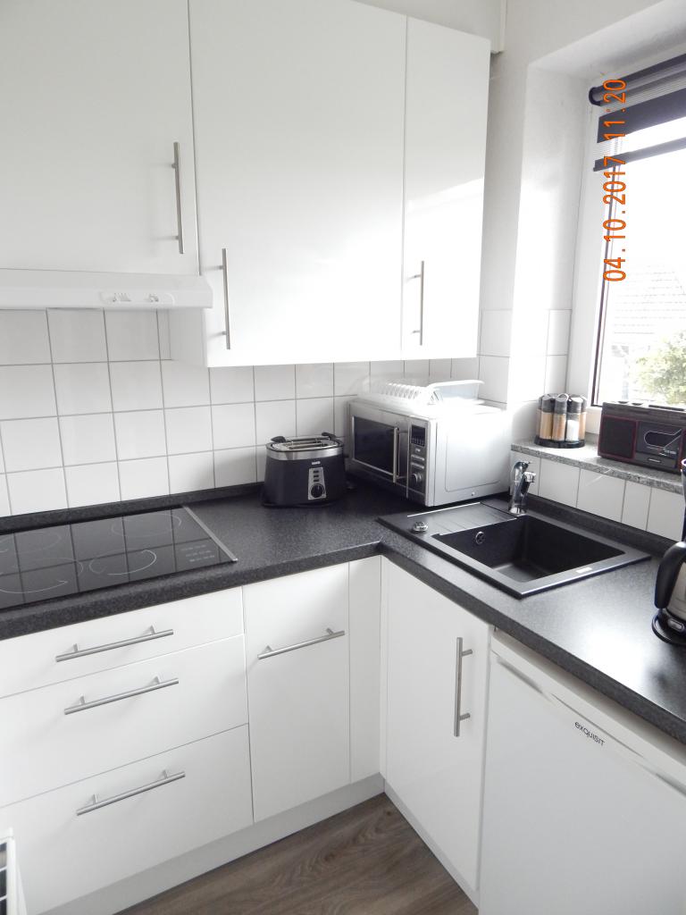 Neue Küche mit zusätzlicher Mikrowelle und alle erforderlichen E-Geräte, Küchengeräte, Porzellan und Gläser.