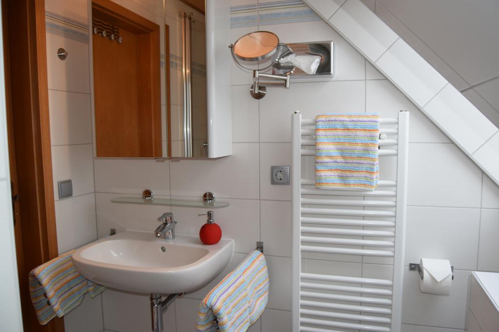 Im Tageslichtbad bieten mehrere Badschränke viel Stauraum für Ihre Utensilien,es gibt einen Badhocker,Föhn,Zahnputzbecher und genügend Handtücher.
