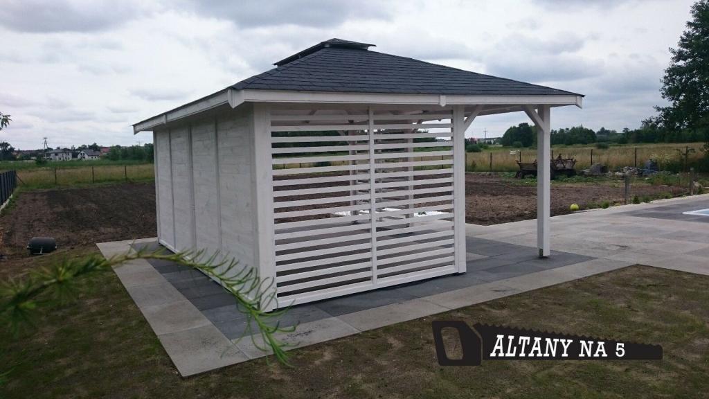Wir laden Ihnen ein, eine schöne Holzgartenlaube aus Kiefer -und Fichtenholz zu kaufen. Die Laube wird aus Kiefernholz herausgestellt. Die ganze Konstruktion wird auf Tragsäulen gestützt. Das Holz wird mit Holzschutz Drewnochron in jeder ausgewählter Farbe imprägniert, Musterkatalog auf eines der Bilder. Die angebotene Konstruktion besitzt drei offene Wände, und eine Wand, die komplett bebaut ist.