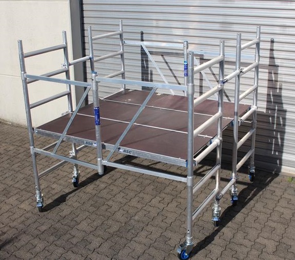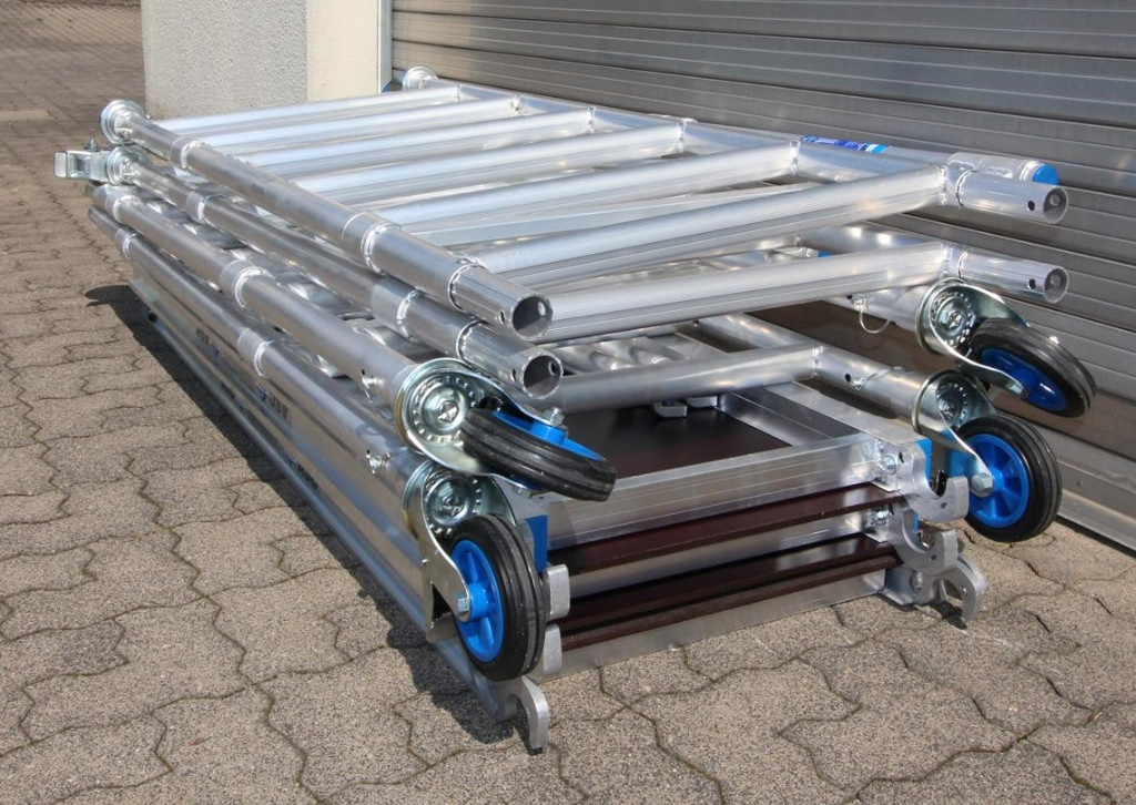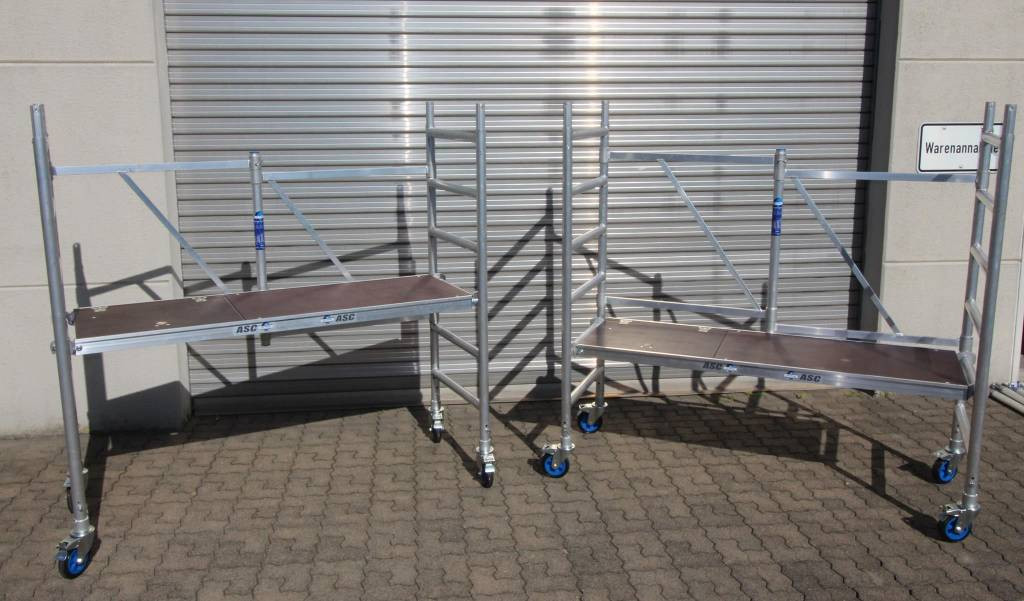 Dieses, in der Verwendung, neuartige Gerüst ist Arbeitsplattform, Zimmerfahrgerüst, Rollgerüst und Rollbock in einem. Es lässt sich perfekt in den unterschiedlichsten Arbeitshöhen (bis 3,85m AH als Rollbock, bis 5,50m AH als Rollgerüst) nutzen, ohne zusätzliche Aufbauteile anschaffen zu müssen. Lediglich zwei Stabilisatoren sind bei der Verwendung als Rollgerüst im Zubehör erhältlich.