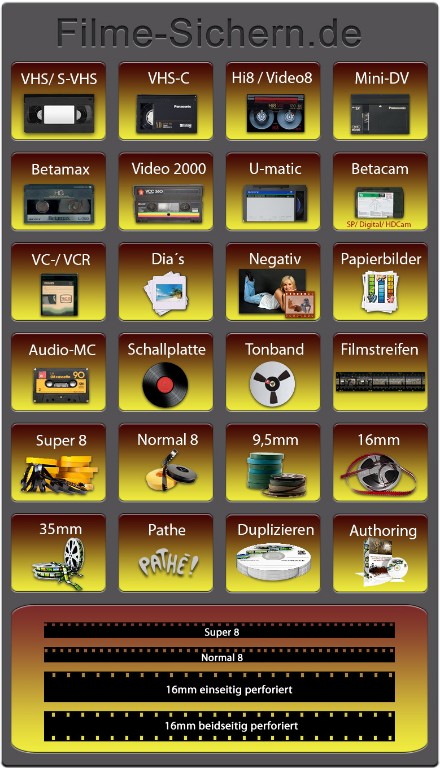 Schmalfilme, Super8, Normal8, Doppel8, Regular8, 16mm, 9.5mm Pathe, VHS, VHS-C, S-VHS, Hi8, Digital8, Video8, Mini-DV, Betamax, Video2000, U-Matic, Betacam SP, Dias, Filmstreifen, Papierbilder, Schmalfilme digitalisieren, Normal8filme überspielen, Hi8 Kassetten kopieren, Super8 Berlin,