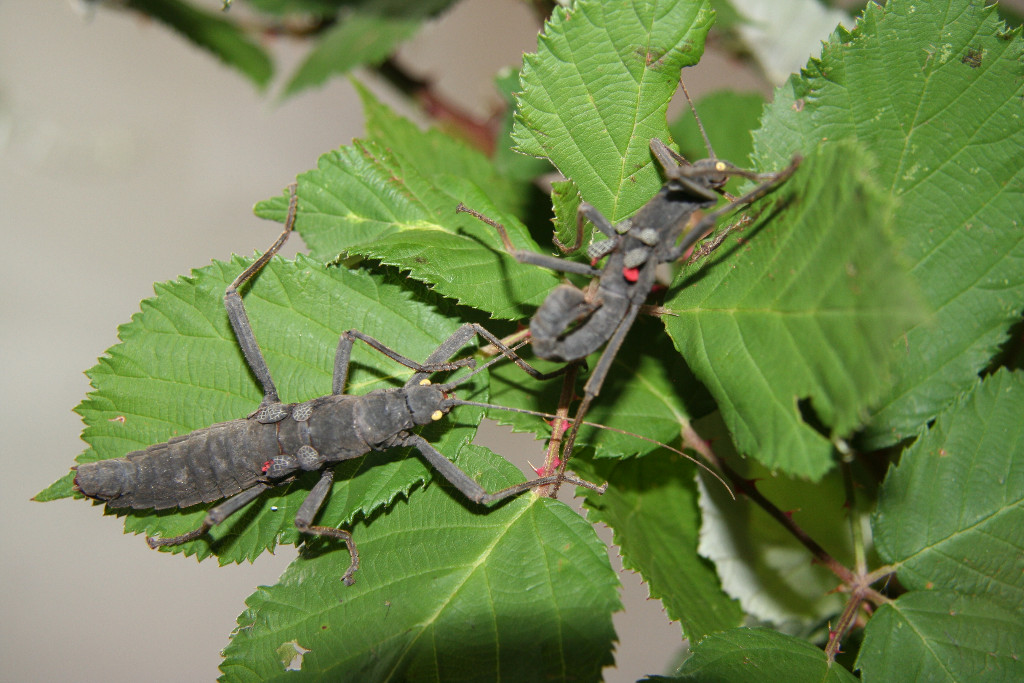 Besonderheiten: Nymphen heben Abdomen immer leicht hoch, adulte Tiere nur noch bei Bedrohung. Wehrsekrete werden zur Verteidigung eingesetzt. Für Nymphen unter L3 sollten die Blätter der läbge nach aufgeschnitten werden. Regeneration. Besonders lebhafte Tiere! Anstatt sich zu bei Gefahr zu tarnen lassen sie sich fallen und rennen schnell weg.