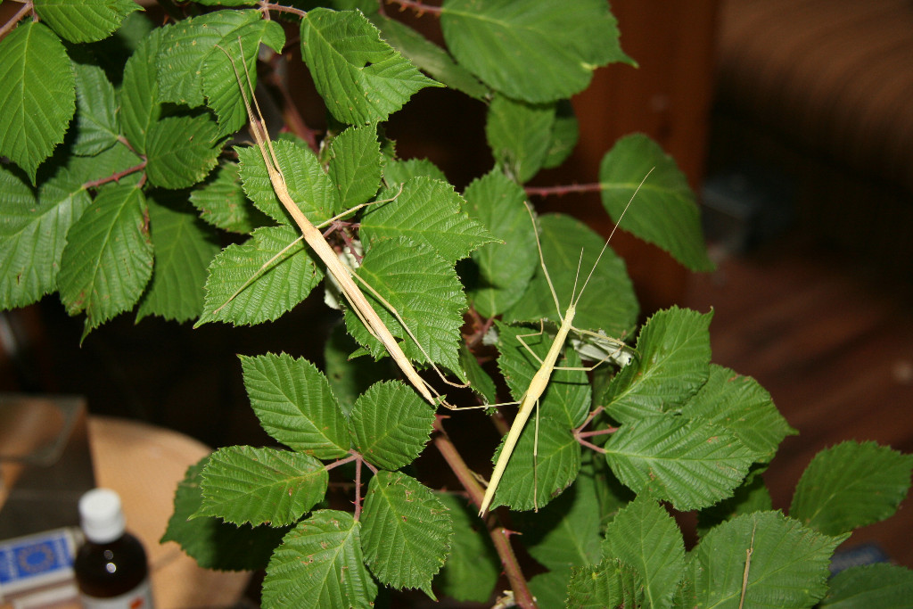 Futter: Brommbeerblätter, Himbeerblätter, Heinbuche, Efeu, Brennessel. (Jede Woche wechseln)