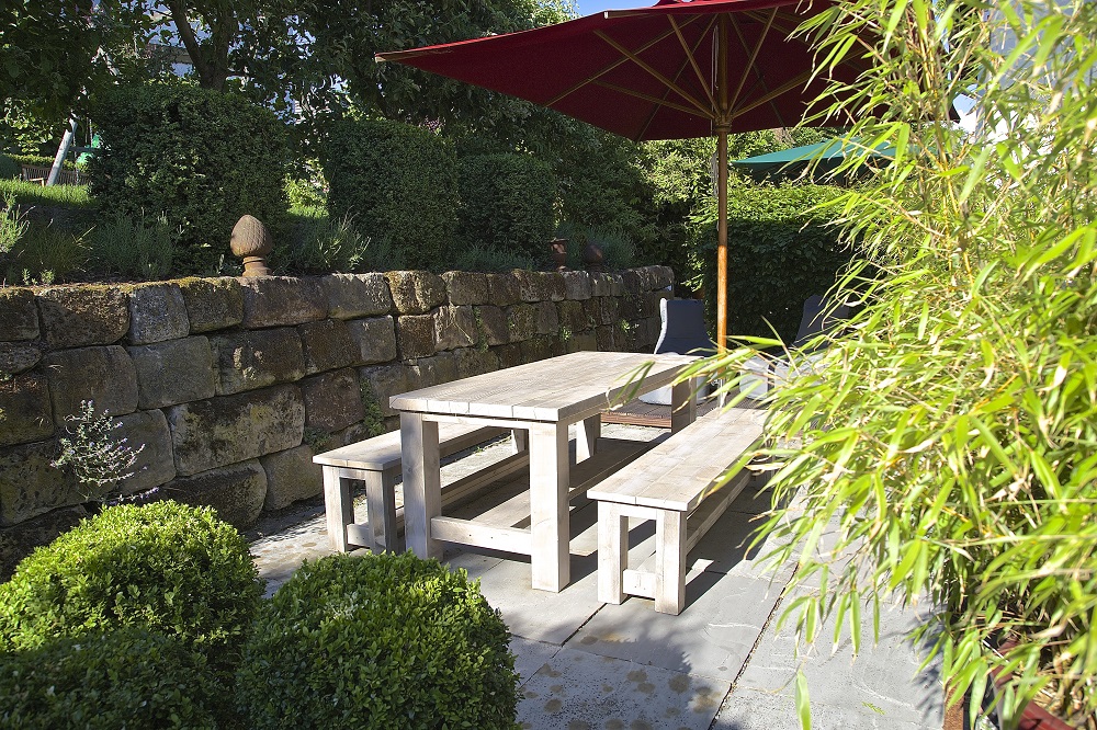 Modell Gera ist baugleich mit unserem Tisch Gera. Die Bank steht auf vier Beinen, die durch Querverstrebungen verbunden sind und der Bauholz