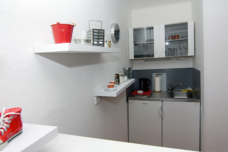 Es erwartet Sie ein komplett ausgestattetes Stundenhotel, bestehend aus einem gemütlich eingerichteten Schlafraum, einer kleinen Singleküche und einem