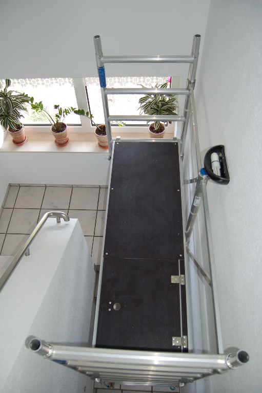 Aluminiumgerüst für den professionellen Einsatz. Ganz gleich ob für Renovierungsarbeiten, Dachrinne säubern, Fassade streichen, sicherer Aufstieg zu schwer erreichbaren Stellen im und am Haus, Decken spachteln, tapezieren, etc. Das Gerüst kann nicht nur in Treppenhäusern, sondern generell auf Untergründen mit verschiedenen Höhen verwendet werden.
