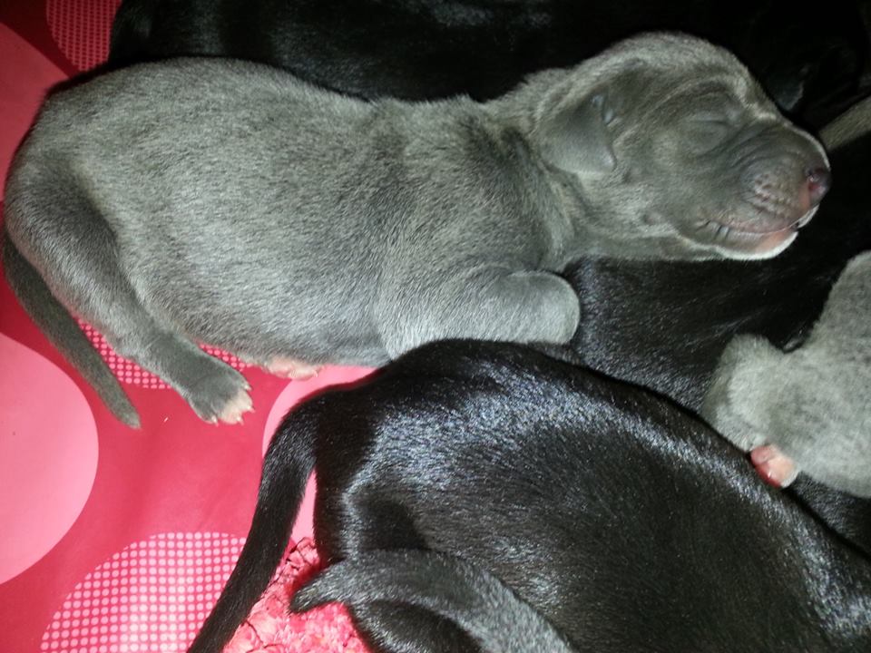 Auf den Bildern sind Paul(schwarz) und Emma (gelb) und die 15 kleinen Welpen zu sehen.