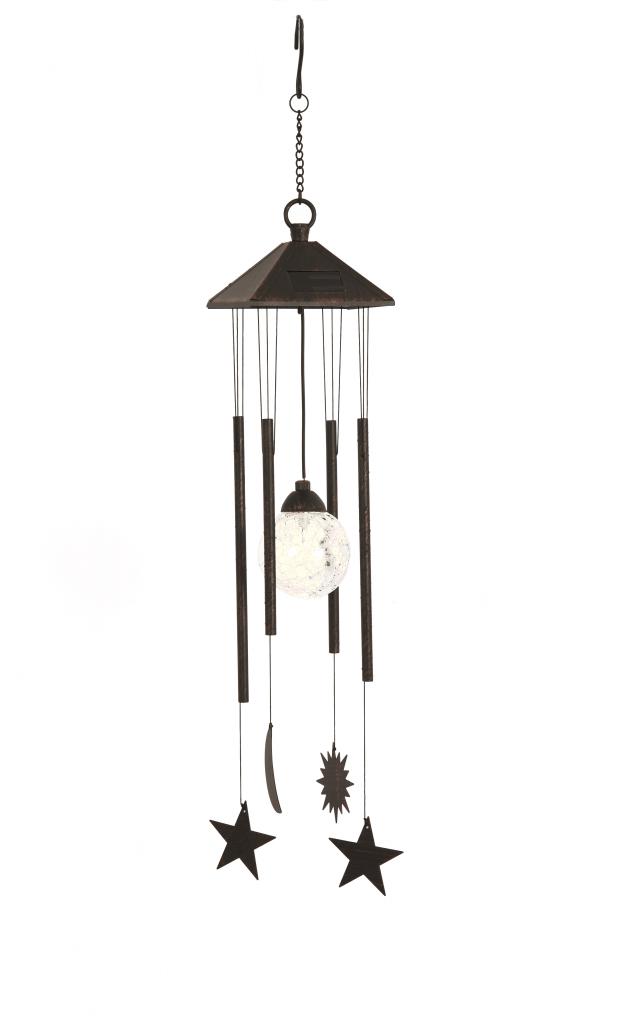Diese Solar-Windspiel mit den Motiven Sonne, Mond und Sterne und einer von innen beleuchteten Glaskugel mit 8 cm