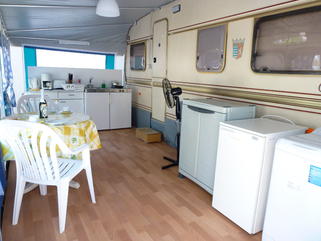 Doppelbetten 200cm x 150cm, 2x Einzelbetten 190 x 80cm, (inklusive Kopfkissen, Zudecke sowie Bettwäsche), Kleiderschrank und Oberschränke, TV-Gerät (mit deutschen Sender), Klimaanlage, Toilettenraum mit Waschbecken und Keramiktoilette die direkt an das Abwasser angeschlossen ist. Im Vorzelt befindet sich eine offene, komplett ausgestattete Küche für 6 Personen, mit Warm-und Kaltwasserversorgung. Herd mit zwei Kochfeldern, Elektrogrill, elektrische Partypfanne, Kühlschrank, Wasserkocher, Toaster, Kaffeemaschine, Waschmaschine. Private Terrasse mit Campingmöbeln,
